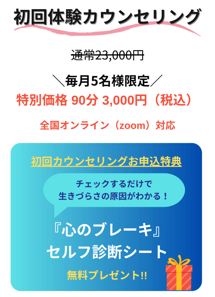 ぜひ、初回体験カウンセリングで「セラピストの雰囲気」「心理セラピーは、どんなことをするのか?」などを確かめてみてください。
